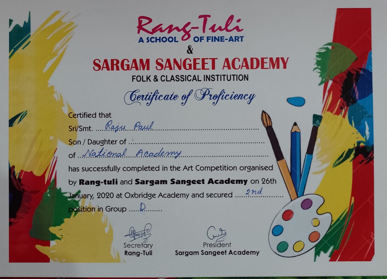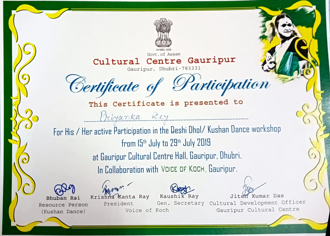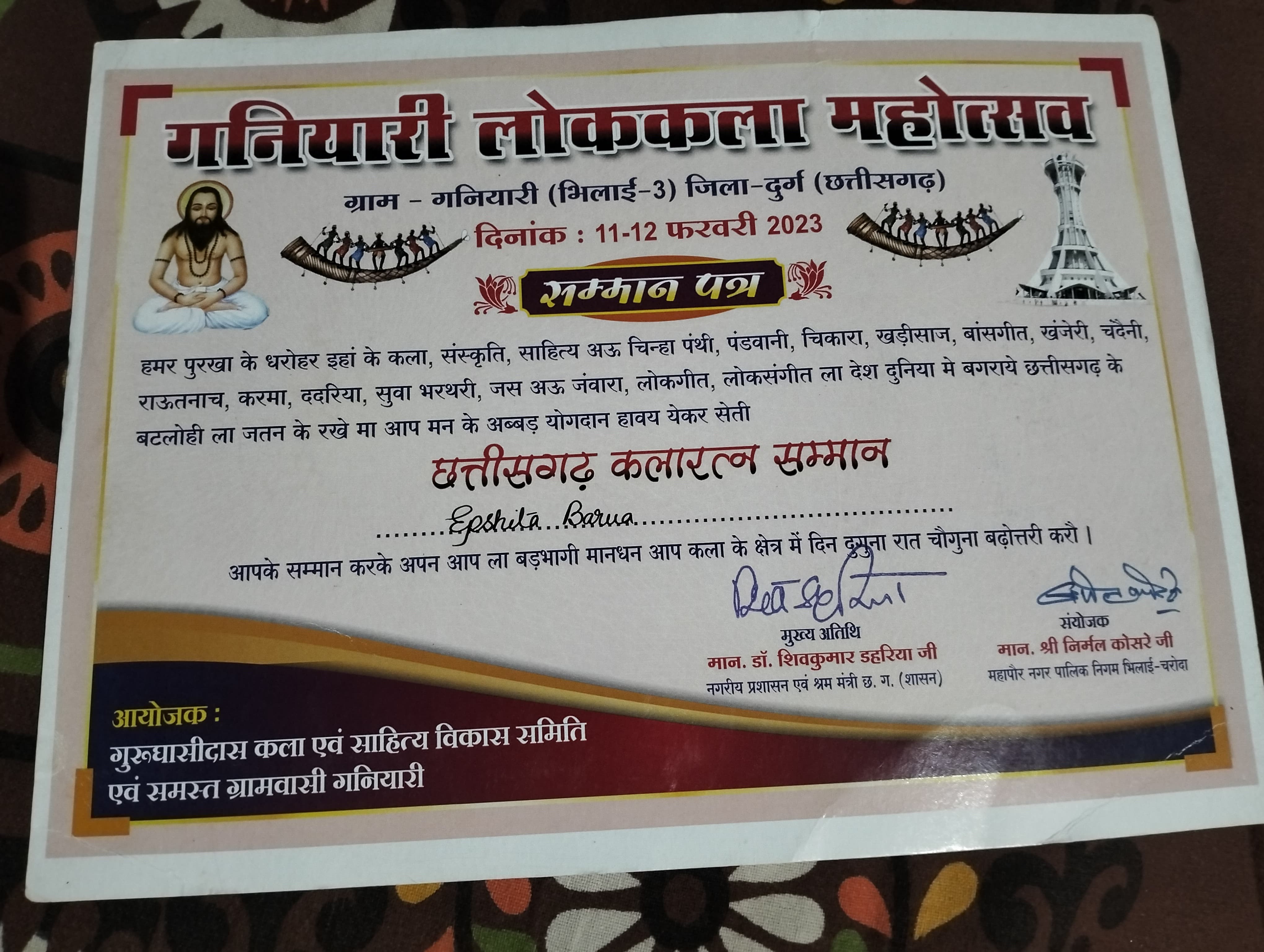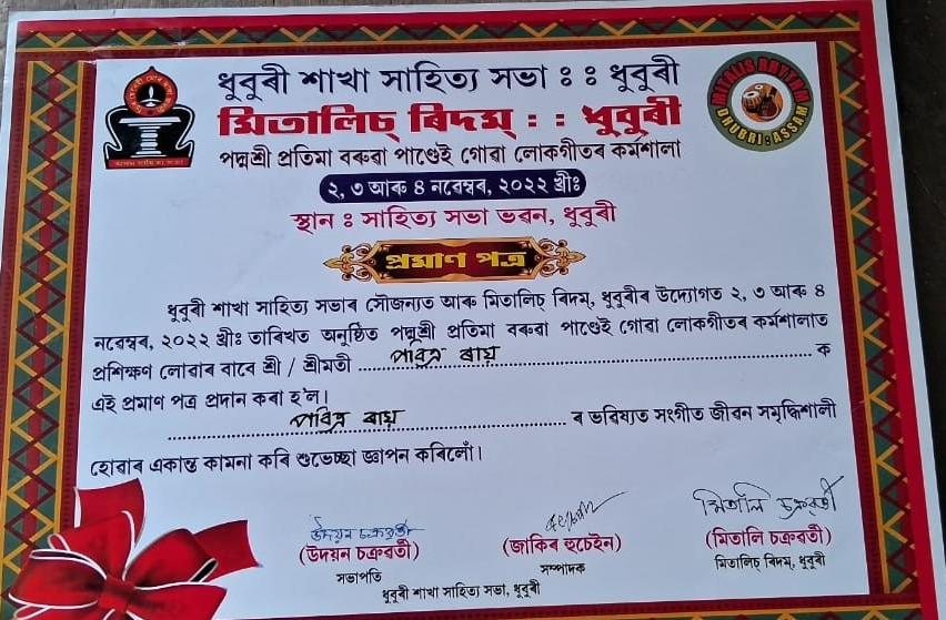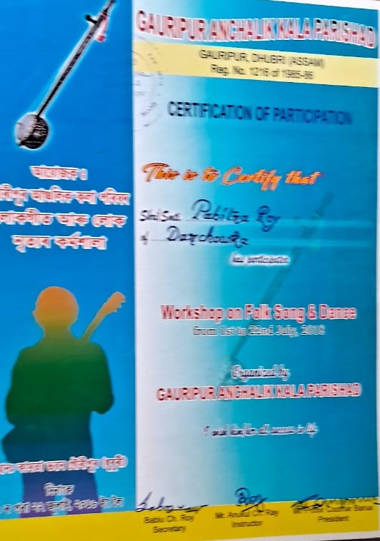 Pabitra Roy, Award of Appreciation for Workshop on Folk Song & Dance