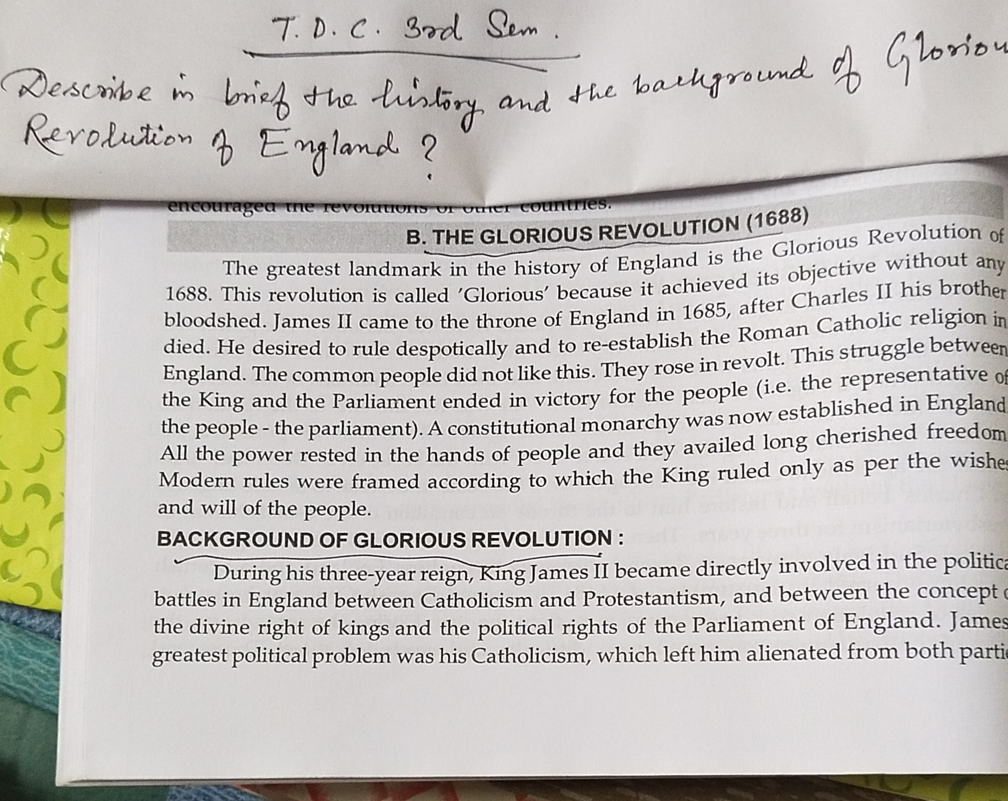 | 2024-05-30 | MRS. DUORI DOLISA CHOUDHURY | TDC 3RD SEM ARTS Honours | History | Describe in brief the history and the background of glorious Regulation of England? | View |